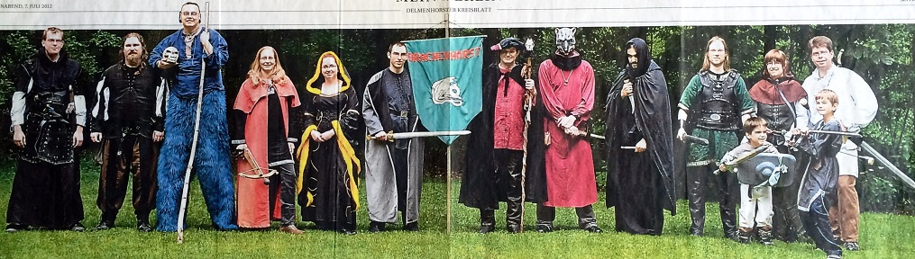 Monster, Maiden, Magier und Meuchelmörder - in "Draskoria" gibt es viele Charaktere. Ein Hauch von Mittelalter und eine gehörige Portion Fantasy prägen das Genre der Rollenspieler des Clans "Drachenhorst". Die Rollenspieler ("Live Action Role Play") aus Delmenhorst, Ganderkesee und der Umgebung kommen von April bis Oktober einmal im Monat für eine Wochenende zusammen, mal im Land- und Freizeitheim Immer, mal auf einem Bauernhof in der Nähe von Brettorf. "Draskoria" ist ihre von Motiven des Mittelalter sowie Anleihen aus der Fantasy-Literatur wie dem "Herrn der Ringe" geprägt Welt mit eigener Zeitrechnung. Ein Spielleiter bestimmt die Eckpunkte, die den Rahmen für die verschiedenen Szenen vorgeben. "Das Kämpfen macht etwa fünf bis zehn Prozent des Rollenspiels aus. Das Adrenalingefühl ist dabei echt, man möchte nicht gefangen werden", sagt Martin Minner. "Freund" und "Feind" zeigen sich auf dem Panoramabild ausnahmsweise einmal in friedlicher Eintracht: Es posieren (v.l.) Christoph Proboscht, Stephan Flemming, Sven Köwing, Christin Minner, Maren Duda, Sebastian Brandenburger, Olaf Duda, Peter Ahlhorn, Martin Minner, Timo Berendt, Kerstin Schade, Oliver Schade sowie ihre beiden Söhne Fabian und Florian.